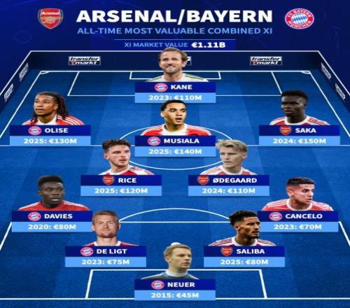 北京时间11月26日,在阿森纳和拜仁慕尼黑即将在欧冠进行直接对话的情况下,德转列出了两家俱乐部历史最贵的11人阵容,2024年身价曾经达到1.5亿欧元的萨卡领衔,哈里-凯恩、穆西亚拉、奥利塞、赖斯以及厄德高也都榜上有名。